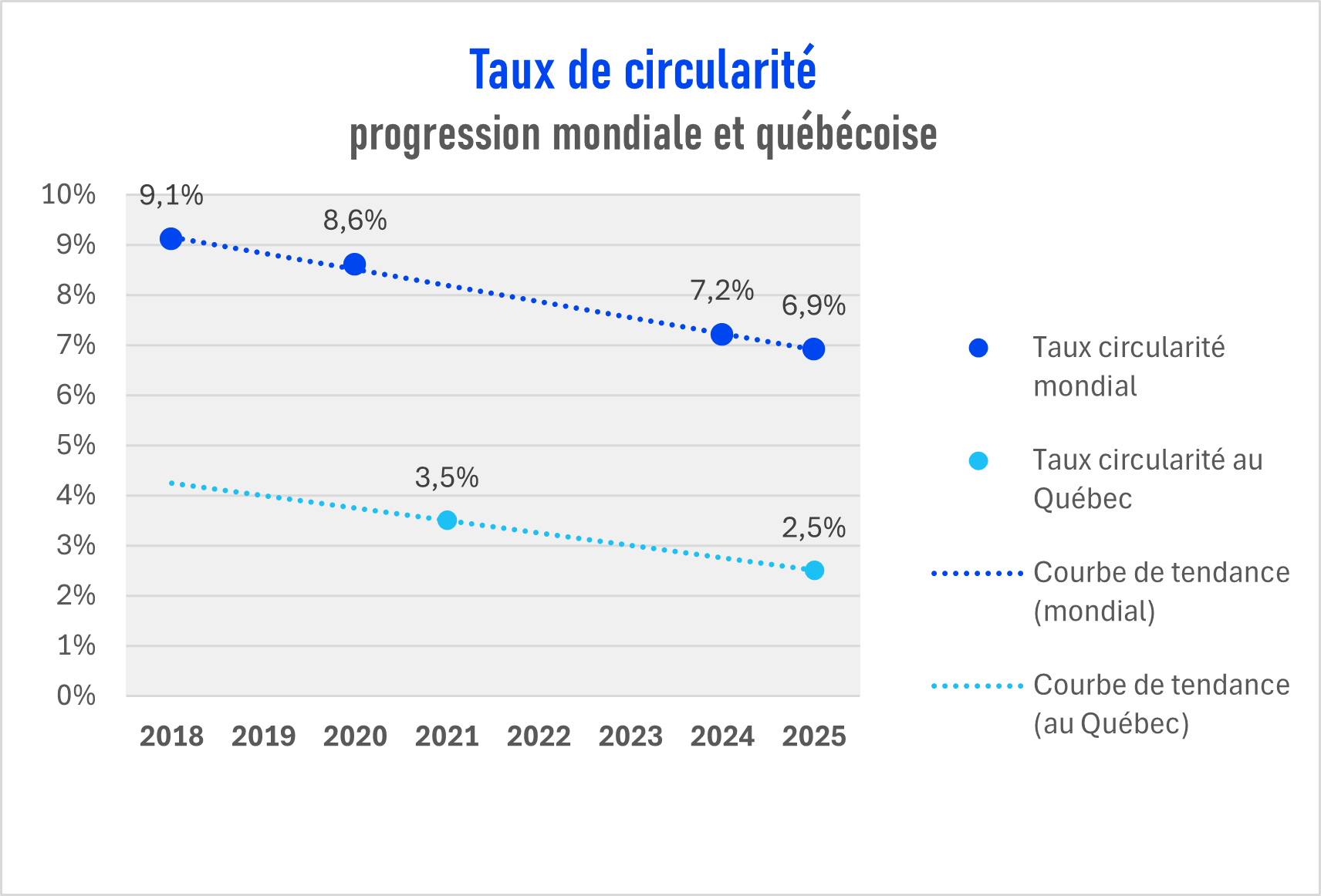 En 2025, de toutes les matières premières qui circulent mondialement, seuls 6,9 % d’entre elles ont été recyclées. Malheureusement, depuis la première évaluation de la circularité mondiale en 2018, ce taux ne fait que chuter. Au Québec, en 2025, l’indice de circularité se situe à 2,5 %.
